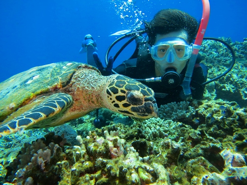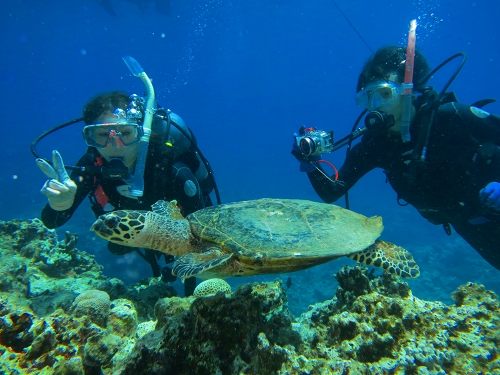 体験ダイビングやスノーケリングなど浅い水深の楽しみ方でも絶滅危惧種のウミガメやたくさんの魚に出会えるのが嬉しいですね!