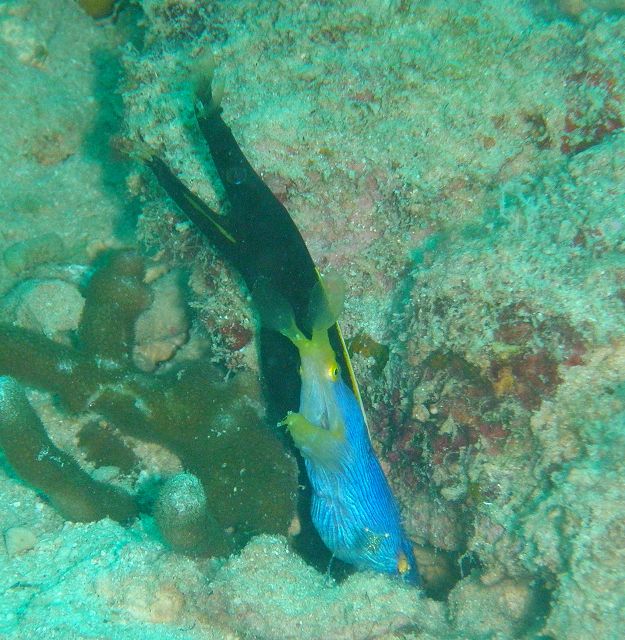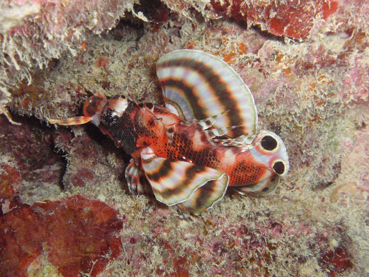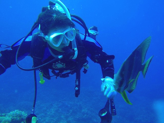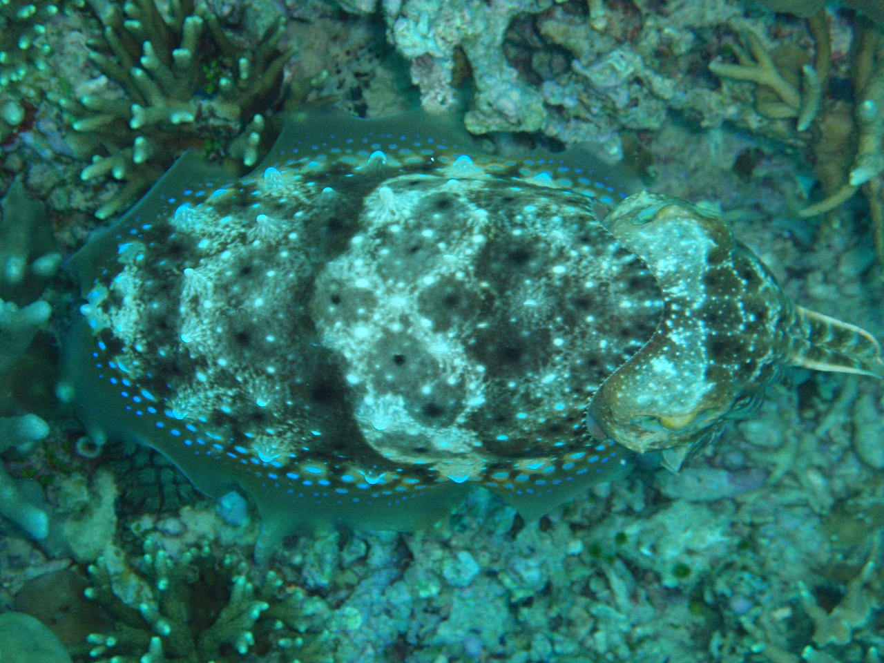 リクエストのコブシメはとは早速ご対面できました♪サンゴの間には、たくさんの卵もありましたね~。砂地とサンゴがとてもキレイなポイントでした♪今日のお気に入りは、テンクロスジギンポです。ハマサンゴの周りをチョコチョコしていてとっても可愛かったようですよ。他には、パラオハマサンゴに群れるハナゴイも一押しの風景でした。しかし、写真は・・・ マダラトビエイ!!ダッシュも意味なく、少し遠目からの一枚となりました♪のんびり潜っていてもその時ばかりは大興奮のもうダッシュでしたね!!