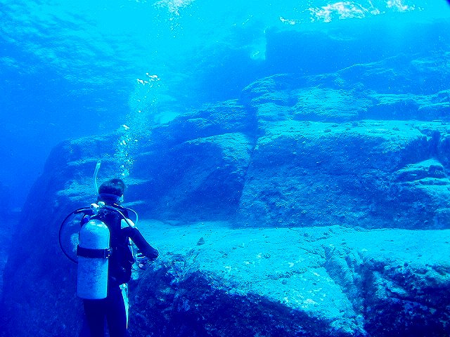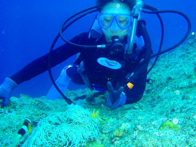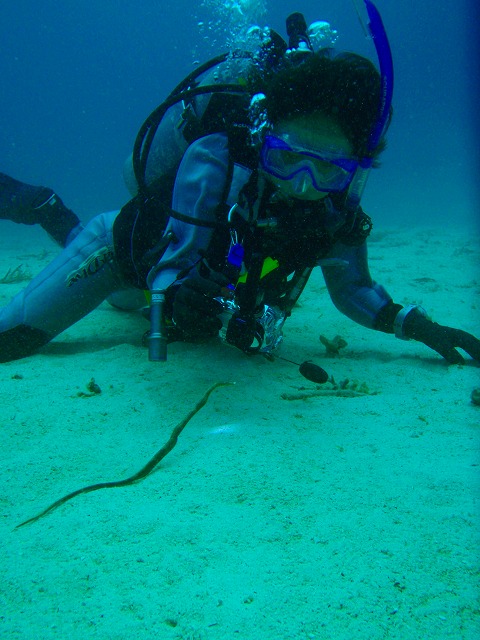 『もう何年も前に洞窟に行ったきりです。』というお客さん。今ではもうすっかり有名な青の洞窟ですが、そんなネーミングさえなかった頃に潜った以来だったので、とても楽しんでもらえました!!なんといってもこの時期ならではで、洞窟内貸し切り♪良かったです!!せっかく来たんだからと、リフレッシュチームも洞窟を目指したようです。緊張しながらのエントリーでしたが、上がってきた時は、とても満足そうでした。明日は慶良間なので、思いっきり楽しんでくださいねーー!! 続いては、マクロ探しです。待望のあのコに会えました!! ムチカラマツエビやすっかり砂地の定番のワカヨウジも健在でした♪遠くに見えたのはナポレオン!!とお客さんを呼んだ時にはもう居ませんでした(汗)幻だったのでしょうか・・・ リフレッシュチームは、2本目でなれてきたのか、真っ白な砂地とサンゴを思いっきり堪能していましたよ♪
