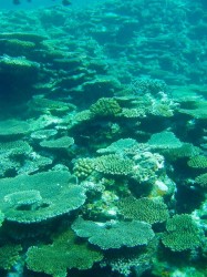 粟国では、ギンガメアジの群れ以外にも、カスミチョウチョウウオの群れ、大量のアカモンガラ、そして、キンギョハナダイの乱舞に元気なサンゴたち。そして心地よい流れ。お腹いっぱいのダイビングポイントです。