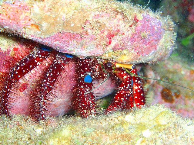 相変わらず神出鬼没のハナヒゲウツボ君♪初めて見たお客さんは、あまりの派手さにビックリしていました。さすがは、ウツボ界のスーパースターでしょうか。続いては、こちらも久々のカイカムリ君。カニなのですが、お客さんは終始?マークでした。初めて見るとビックリするような生き物が沢山いるのが海ですよね。ダイビングって面白い!!