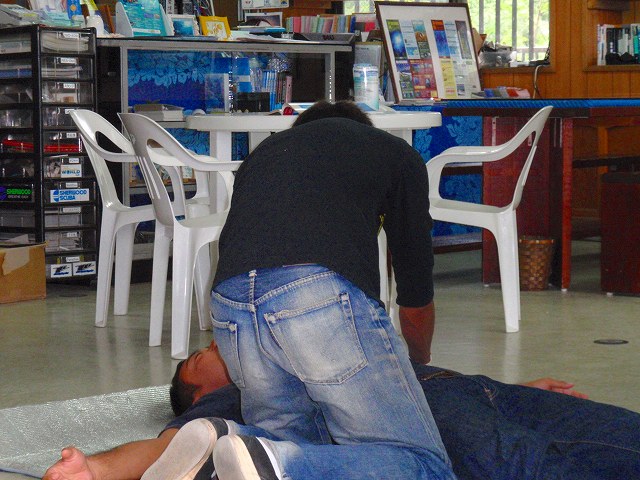 「子供の為のケア」「AED」「1次ケア」「2次ケア」という幅広い内容に加えて これらをインストラクションする時のデモンストレーションレベルのスキル開発と 互いに生徒役、インストラクター役になってのプレゼンテーションをしたりと盛りだくさん。