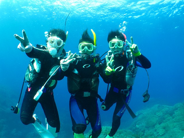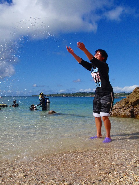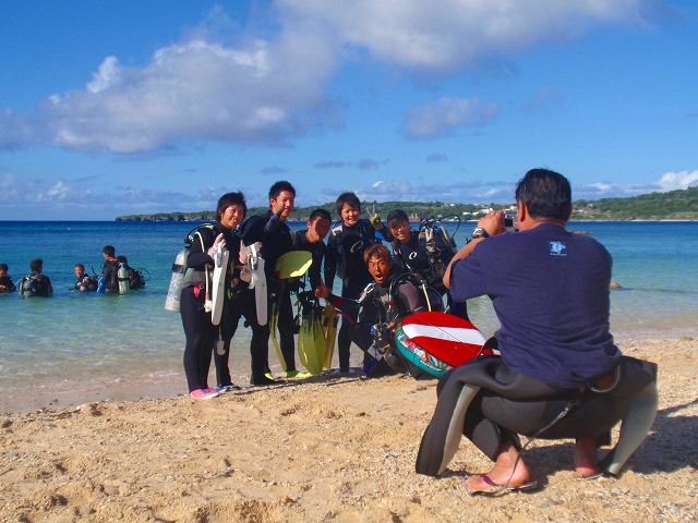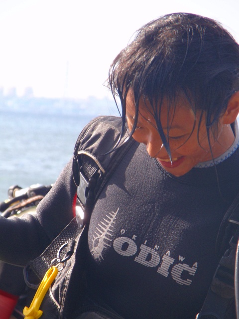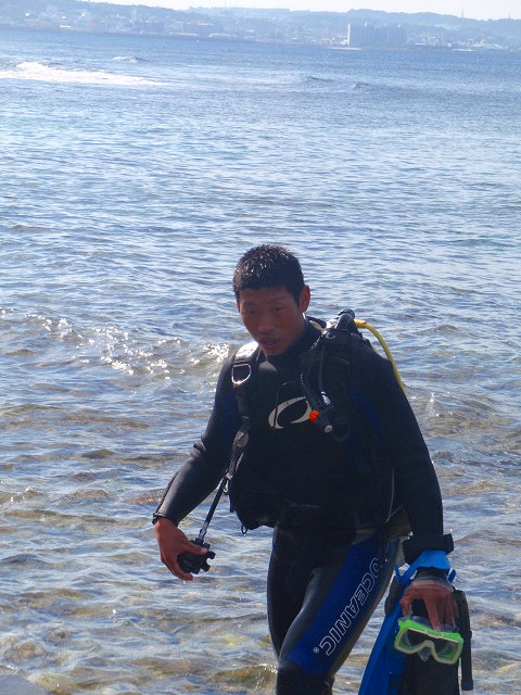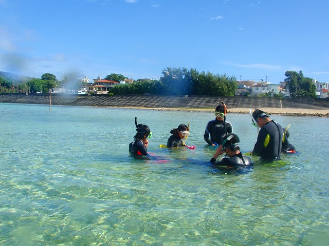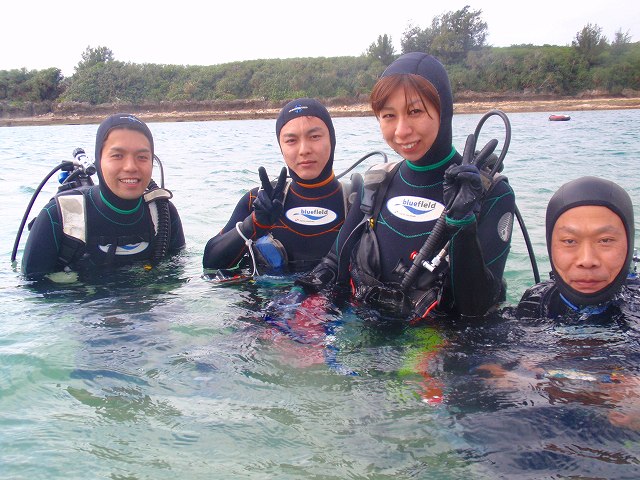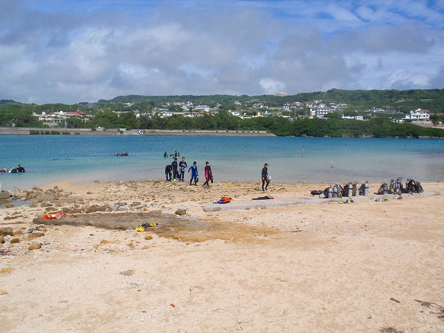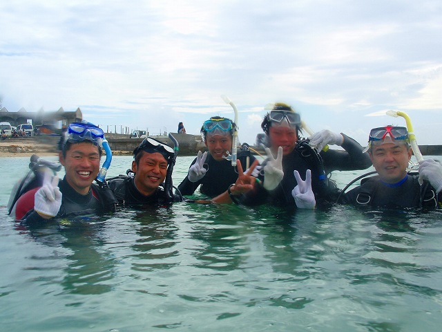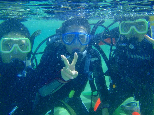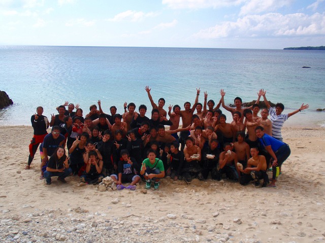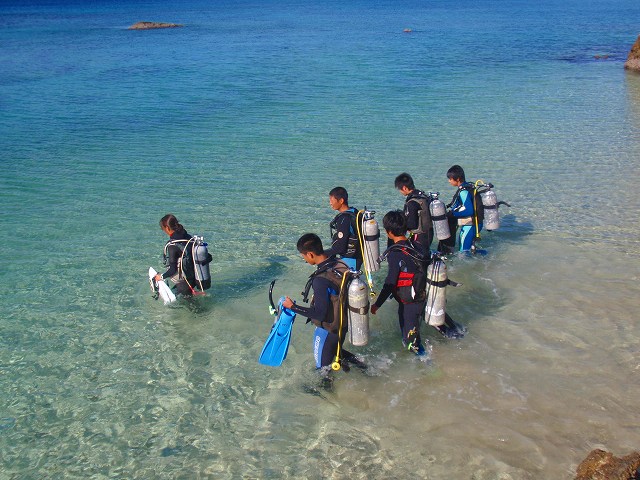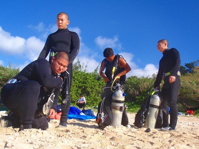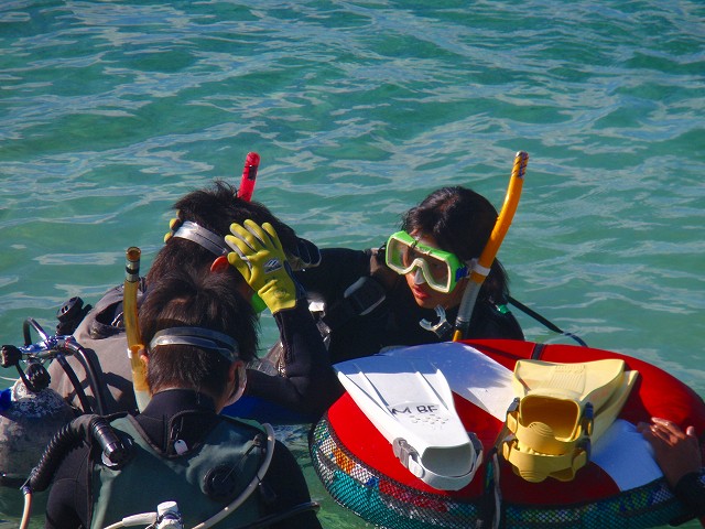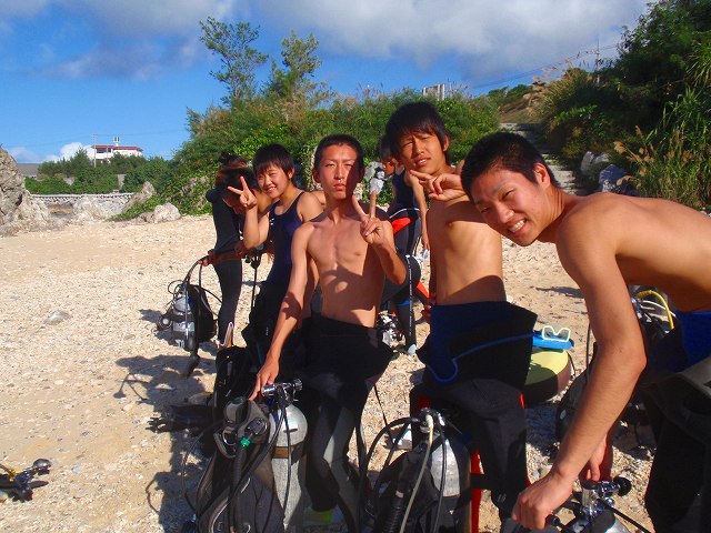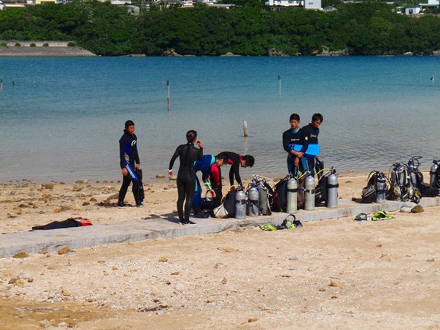 今回いらした千葉県柏市立柏高等学校の皆さんは、なんとオープンウォーターダイバーのCカードを取得するというのが目的です。一昨年から始まったこの講習も3回目を迎えますが 参加する生徒さんは当然の事ながら初めての方ばかり。受ける方も開催する方も新鮮な気持ちです。先日の土門の報告にもありましたように、学科部分と筆記試験は事前に済ませ、実習部分を沖縄のキレイな海で行うのです!私、山崎は初日だけでしたがサポートスタッフとしてこの講習に参加してきましたのでその時の模様をレポートしたいと思います。