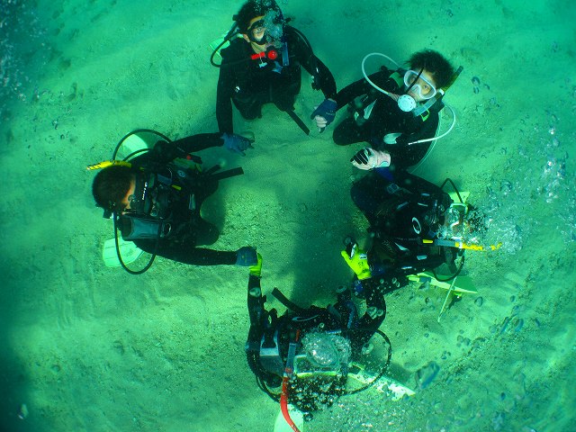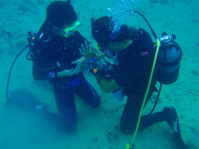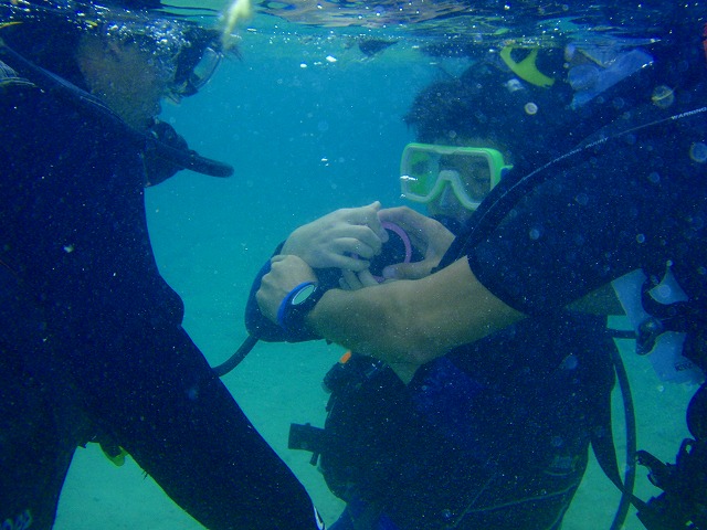 下の写真は、緊急時にバディとエアを共有するときの手順。「海猿」のおかげで一般の人も分かっていただけるようになりました。それから、ウェイトの取り外しと付け直しなどなど。ダイビングは、10歳の子でも60歳過ぎの方でも出来る水中でのアクティビティなのですが、いざ!という時に備えて緊急時の対処法もしっかり講習で習います。
