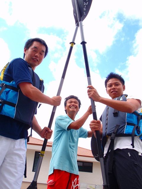 ダイビングは、飛行機に乗る日にはできないので、最終日が空いてしまう、っていう方いらっしゃいますよね。どうしても水遊びをしたい、っていう方に帰る日のメニューとしてもお勧めのカヤック。青空バックに記念撮影。