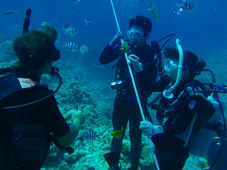 写真は、スキルの練習が終わったところで、マジシャン渡部がエサなしでお魚をよんでいるところです。だまされたロクセンスズメダイやヤマブキベラが群れてきましたね。