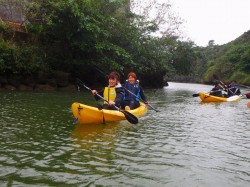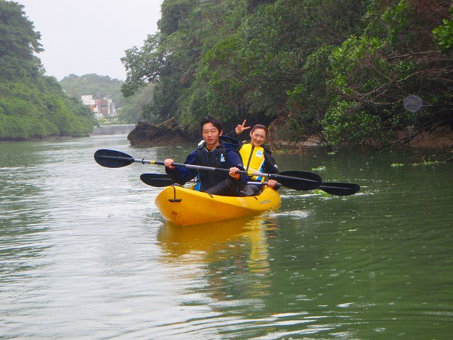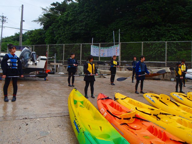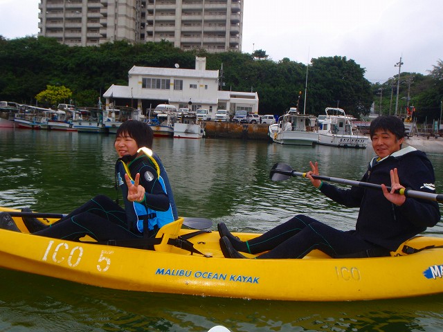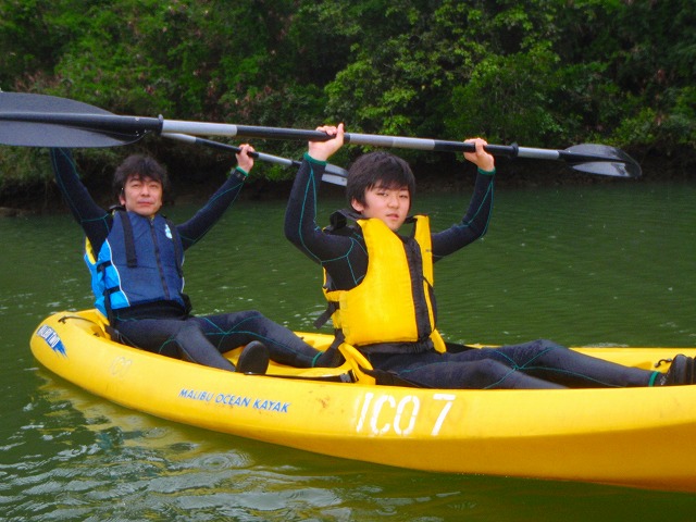 出発前にポーズを決めていただきました。 実はこのとき、まだパドルの持ち方さえ説明する前なので カヤックっぽくない感じになっていますが 本人たちに責任はありません。僕のリクエストです(笑)