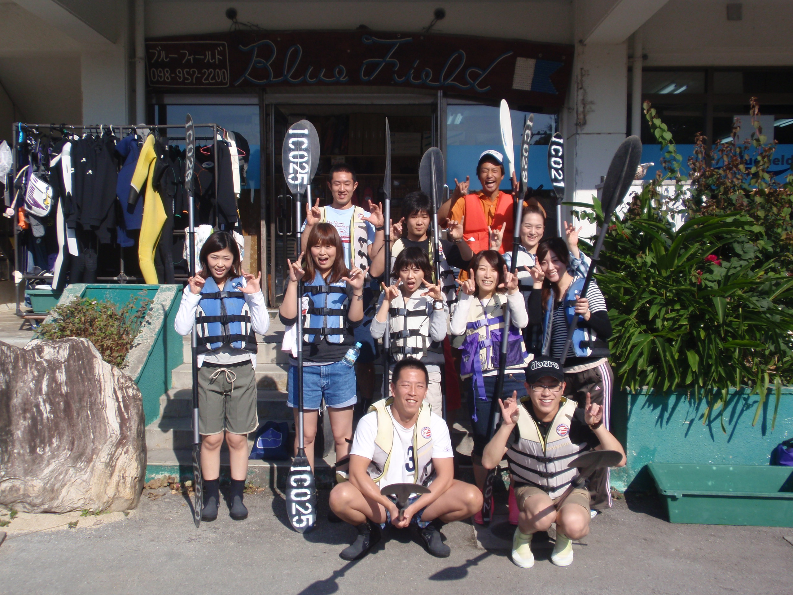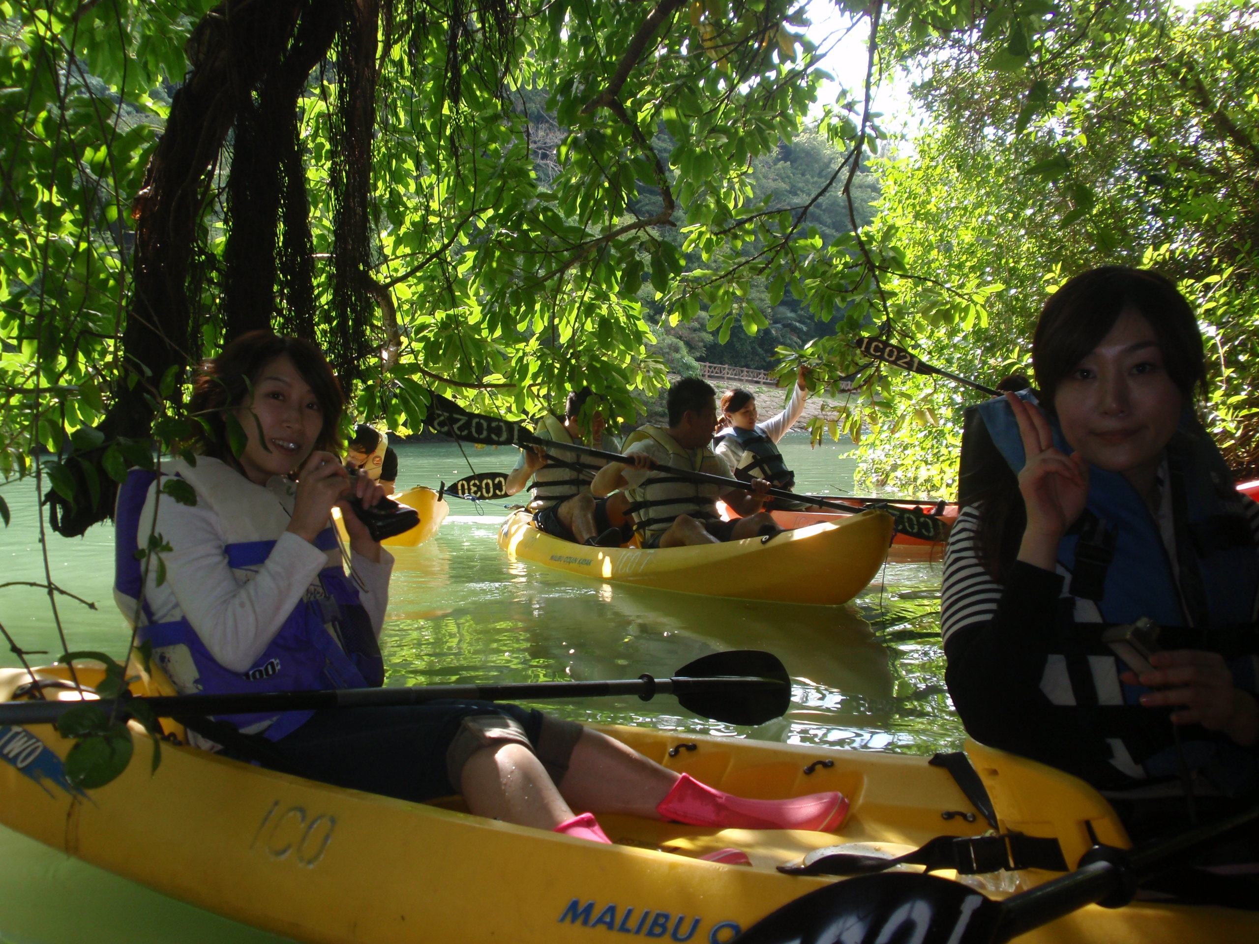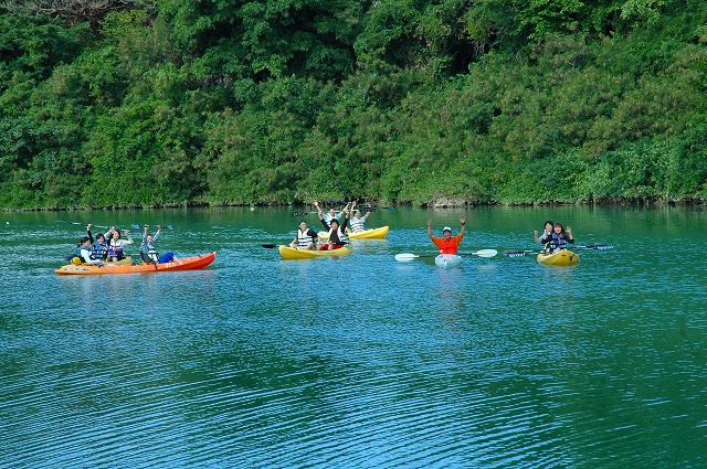 担当したお客さんは3名。沖縄に来るのは初めてという2人と沖縄好きリピーターの皆さん。初めてのカヤックにわくわくしながら岸でパドリングの練習をして「いざ出航」