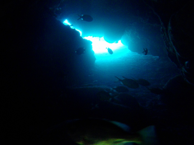ここは洞窟と砂地、そしてリーフの上のサンゴに群れる魚たちがとってもキレイなポイント。