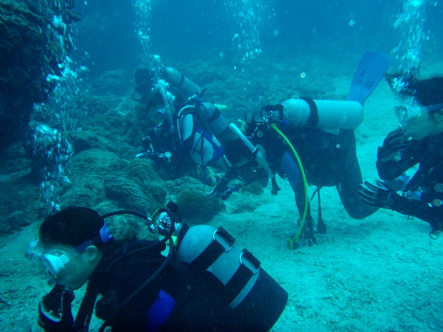 そう、狭い穴を通るときには、同じチームの後方から来るダイバーのためにも、砂を巻き上げないフィンキックが必須になってきます。自分の体と水底が近いので、なおさら難しいですが、そろーりそろーりと小さなアオリ足で。