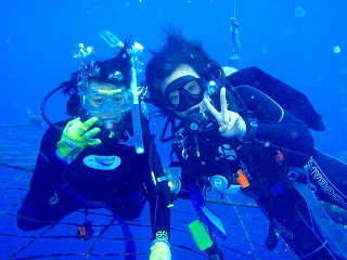 今日あたりは真栄田岬はスノーケラーとダイバーが沢山いるはず。そしてビーチダイビング嫌いな今日のお客さんは器材を背負って階段なんて!ッてことでプールで楽チン講習をしようって事になったのでした。