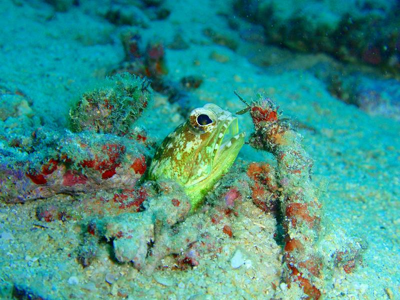 まずは1本目。ジョーフィッシュくんの写真を撮りに行きました。ここの子は、結構人見知りをせず、ちょっと引っ込んでも、また顔をだしてくれます。粘り強く観察していると、口をあけているところや、キョロキョロしているところなど、いろんな表情が撮れますよ♪