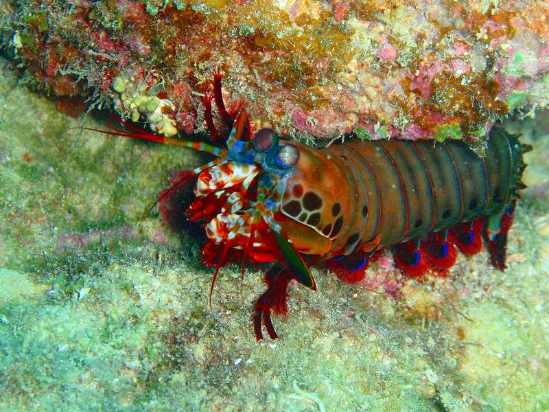 と、ヤギについたガラスハゼを見ていたら、足元にモンハナシャコが現れました。