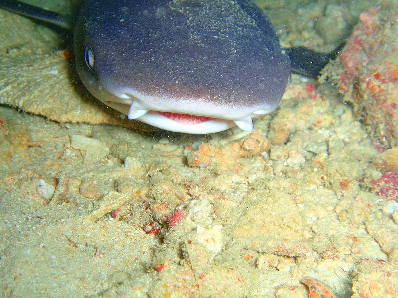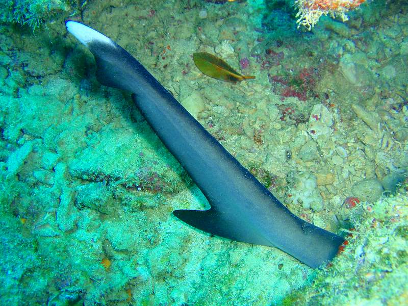 イナンビシではお目にかかる確率の低い、ネムリブカが隠れていました。頭を岩のしたに突っ込んでお昼寝していたので、顔の写真はすごく撮りにくかったですが、2枚の写真をつなげて完成??でしょうか。