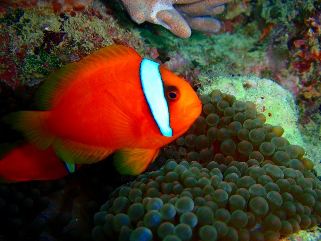 クマノミがいっぱいいるところに船をとめたので、潜降するとすぐにクマノミ、ハナビラクマノミ、ハマクマノミ、そして、カクレクマノミ。