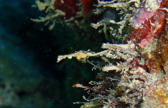 うねりがあると、写真はとっても難しい・・・糸くずのように小さな、ピグミーシードラゴンです。よーく見ると、ちゃんと目もついていますよ!