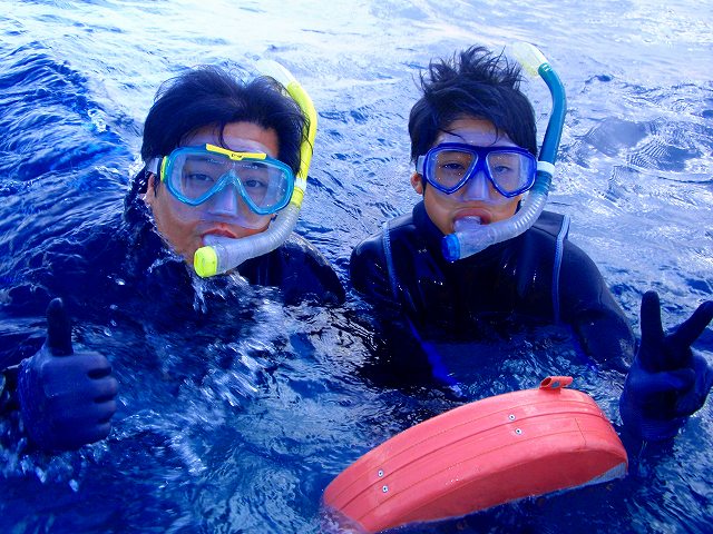 体験ダイビングのお二人は、スノーケリングで肩慣らししてから、初めてのダイビング。