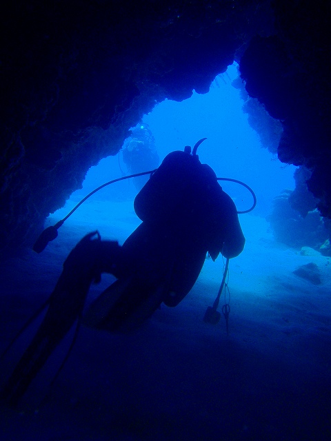 2本目は、いよいよ洞窟探検。いくつかくぐれる穴をとおり、中に群れるアカマツカサやハタンポを見たり。