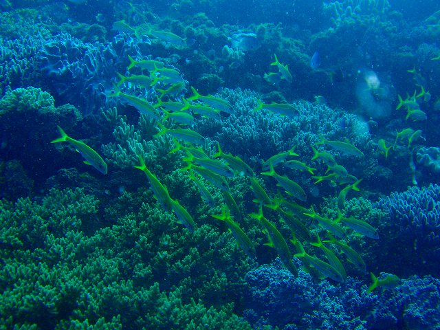 あえて、浅めの中層を泳いでツバメウオに遭遇したり、浅瀬のリーフでは、100以上もいるアカヒメジの大群に皆で囲まれました。