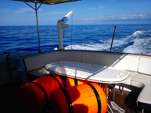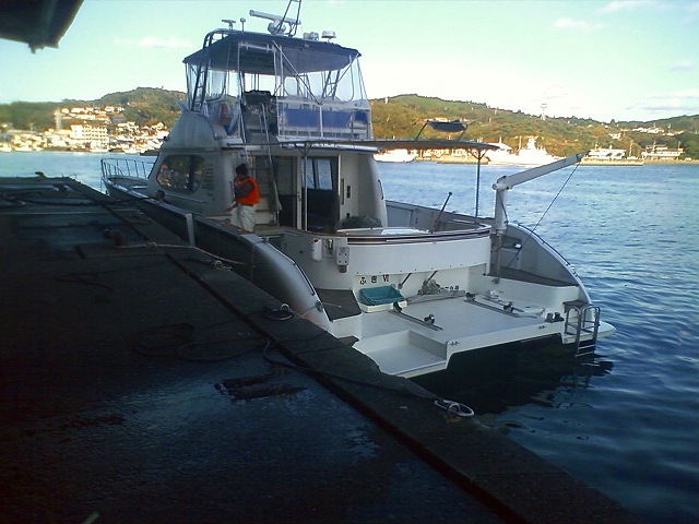地元の漁船に囲まれてビーフラップのキャビンでは