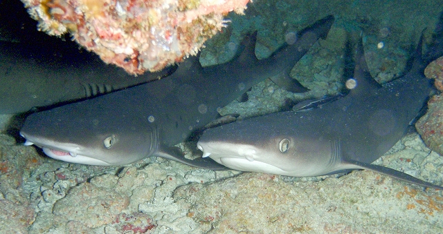 今日はホワイトチップシャーク(ネムリブカ)が岩陰のしたで3匹並んで仲良くお昼寝していましたよ♪