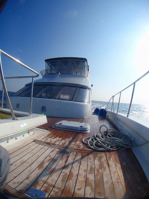 船首にもこれだけのスペースがあるので、「タイタニック」気分で沖縄の海を独り占めするもよし、昨日の海日記のように、イルカやクジラに遭遇すると、絶好の観察スポットに。