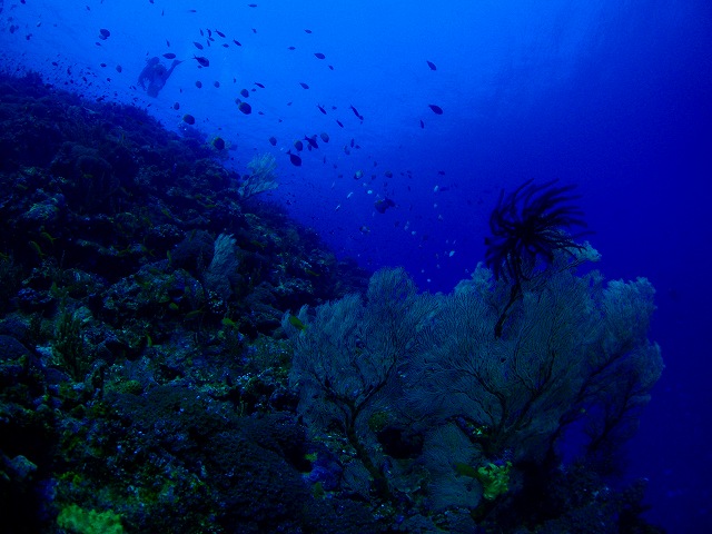 キンギョハナダイ、ハナゴイがサンゴに群がり、カスミチョウチョウウオが乱舞。時に流れるポイントなので、おおーきなイソバナが成長しています。おっと、沖に目を走らせるとナポレオン・フィッシュが!