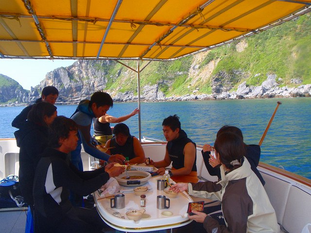 デッキにもソファーがあり、ウェットスーツのまま座れるので、「テーブルを囲みながらごはん」なんていうことができちゃうのです。キャビンもゆったり。こんなゴキゲンなボートでは、鍋やバーベキューがうってつけですね。