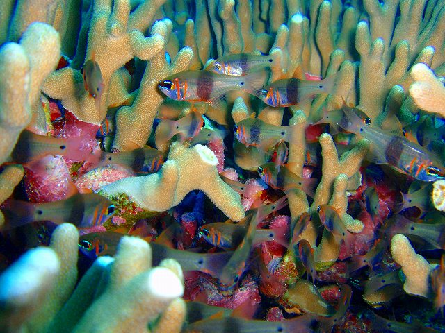 トウマでは、デバスズメダイがユビエダハマサンゴに群れているところを見たり、そこをよーくのぞくと、たくさんの「クロオビアトヒキテンジクダイ」という舌を噛みそうな名前の小魚がたくさんいます。それがとってもカワイイんです。目は上下にエメラルドグリーンのアイラインが入っていて、その脇に2本のオレンジの筋。黒いシャドウをいれてから、おしりにはポチっと点が。