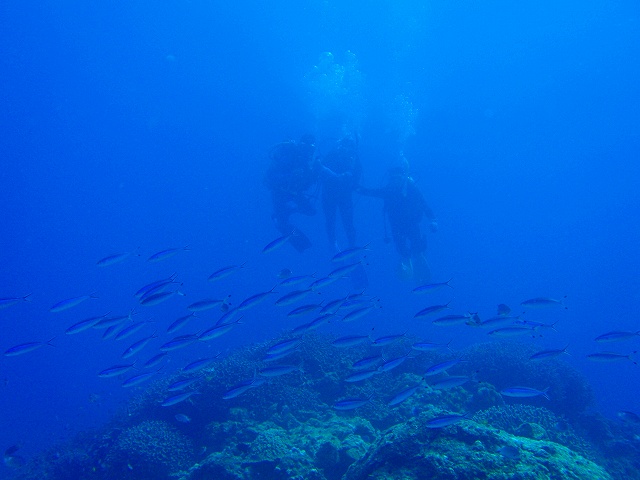 体験ダイビングチームは、たくさん現れたグルクンの群れに囲まれながら、ゆうゆうと泳いでいましたよ。