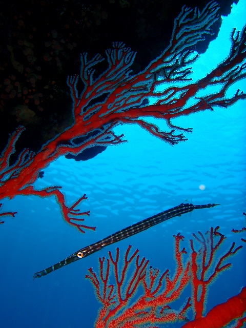 イソバナに擬態して一生懸命隠れているヘラヤガラの幼魚は写真を撮ろうとすると