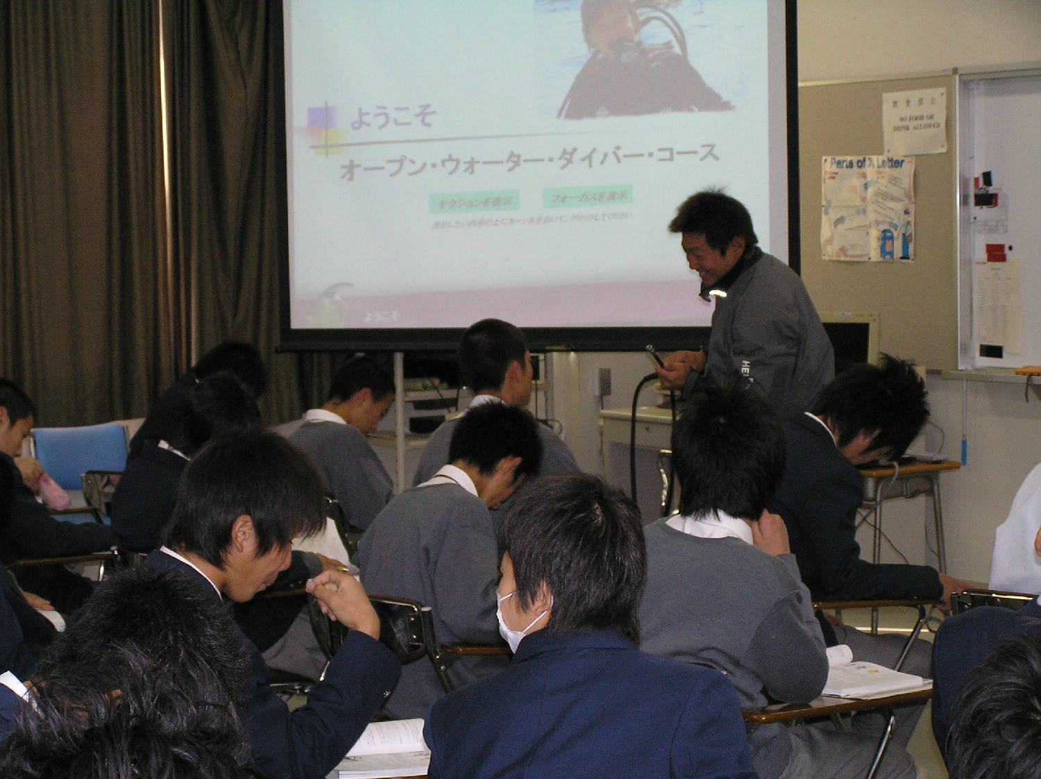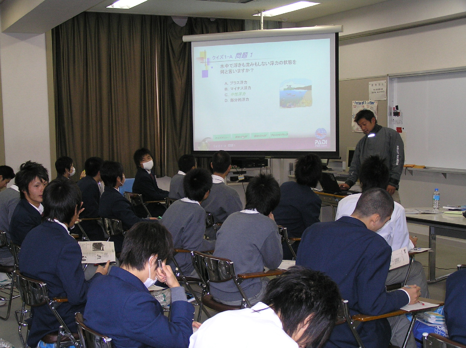 そして、ダイビングの基礎知識をつけるためプロジェクターを使いながら講習再開です。みんな分からない所を自ら聞きに来てくれたり質問してくれたりとやっている僕も気持ち良く講習ができました。