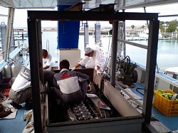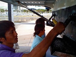明日には、また、たくさんのお客さんを慶良間にご案内しなければならないスウィフト号。作業の遅れは許されません。幸い、3日間ともお天気にも恵まれ、順調な進捗状況。 のはず。
