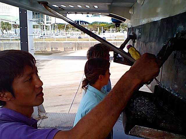 1年間のスウィフト号の頑張りをいたわるように、丁寧に船底の汚れを落としています。海藻や小さな貝殻などガンコな汚れがいっぱいついています。いっしょに、古いペンキも落としていきますが、かなりの力仕事です。