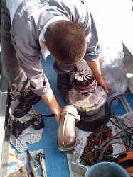 船上では、ヤンマーさんのメカニックの方たちが大勢来られて、エンジン回りの作業をしてくれています。左側の写真はターボチャージャーを取り外しているところ。 大きなターボチャージャーでしょう。。。