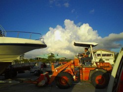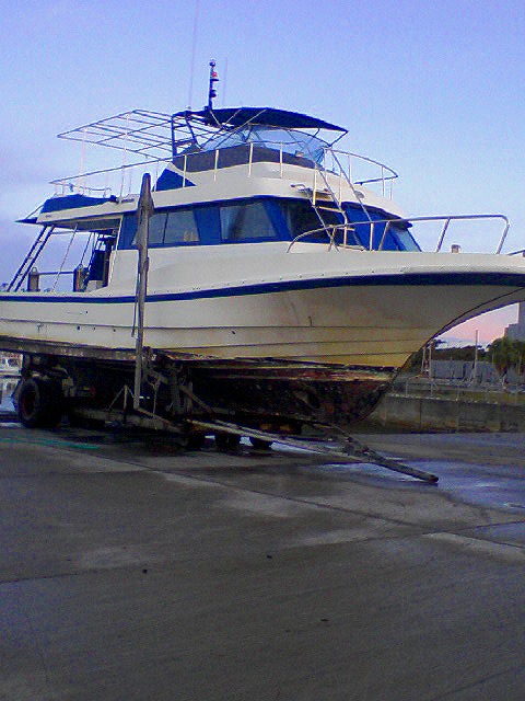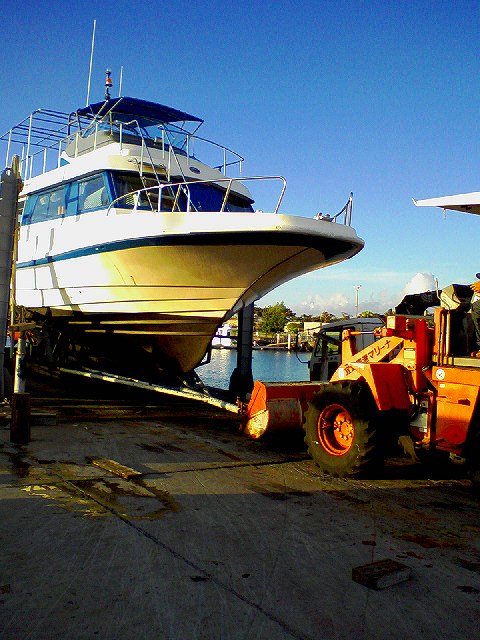 母港の嘉手納漁港から回航して、作業場の宜野湾マリーナで陸揚げ。 初日は船体のクリーンナップとオーバーホールや交換の対象部品の取り外しが主な工程です。