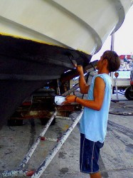 特級塗装技工士(?)の渡部を中心に3名でペンキを丁寧に塗っていきました。 船底のペンキは見栄えのためでではなく、船体を保護するためにとても重要です。今回は、藻や貝殻などの汚れが付きにくく環境に優しい塗料を塗りました。初日の写真に比べるとずいぶんキレイになったでしょ。
