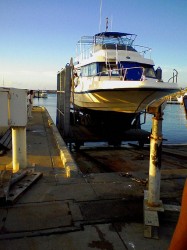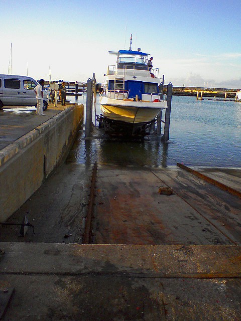 スウィフトを海に降ろすため船台を重機でプッシュバックしています。離陸するときの飛行機みたいですね。