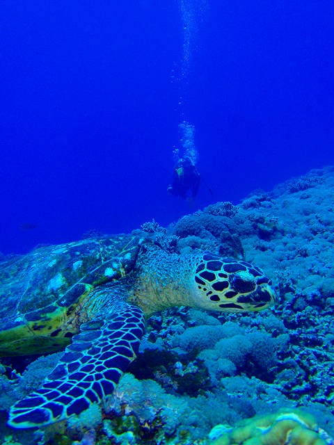 「水族館では見たことがあった」というウミガメも、やはり自然の中で見ると、まったく感動が違いますね。しかも、私たちダイバーを気にせず、ランチタイムしています。