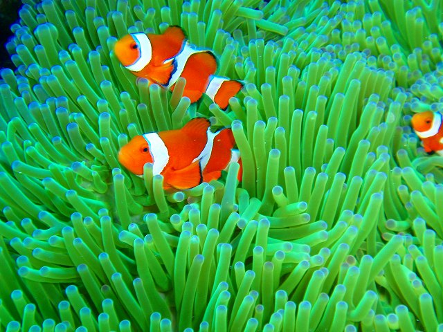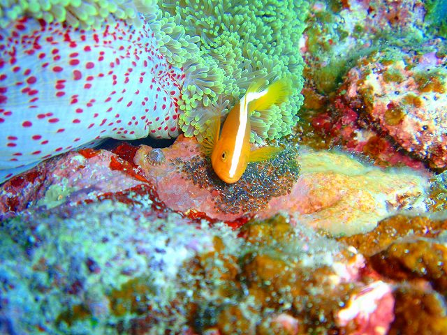 午後のポイント、アカヤーでは、キレイなサンゴ礁の中のイソギンチャクに、「ニモ」、カクレクマノミがいるのを見ることができました。