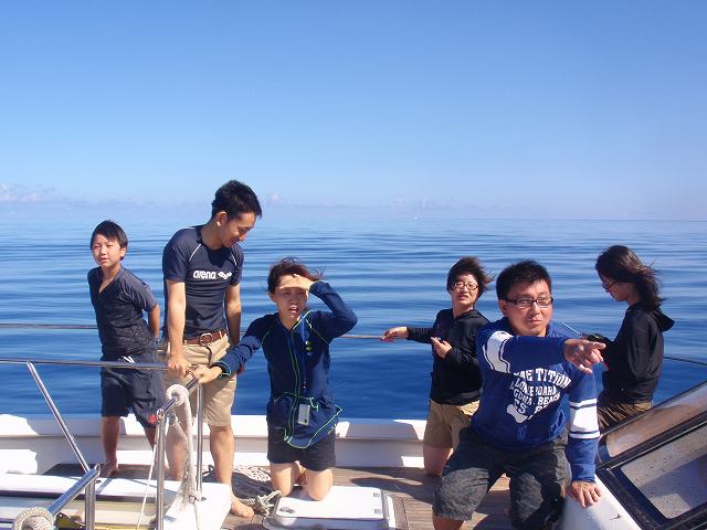 今日の行きはベタ凪。鏡のような海を滑るように船は進みます。写真は、「トビウオ飛んでるよぉー」っていう瞬間の皆さんです。新婚旅行No2の方、ファミリーで2Days体験ダイビングスペシャルにご参加の方、こんなベストコンディションの沖縄の海を楽しめてよかったです。
