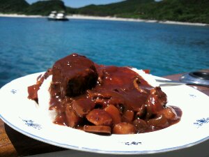 お昼ごはんは、お弁当に加えて、船長お手製のビーフシチューも参戦。
