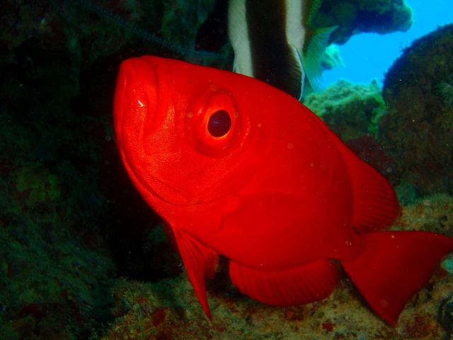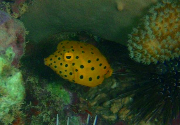 下は、ミナミハコフグの幼魚。岩陰に隠れていました。シャイで、ちょこちょこ動くので写真は難しいですが、ダイバーの間では、永遠のアイドルですね。