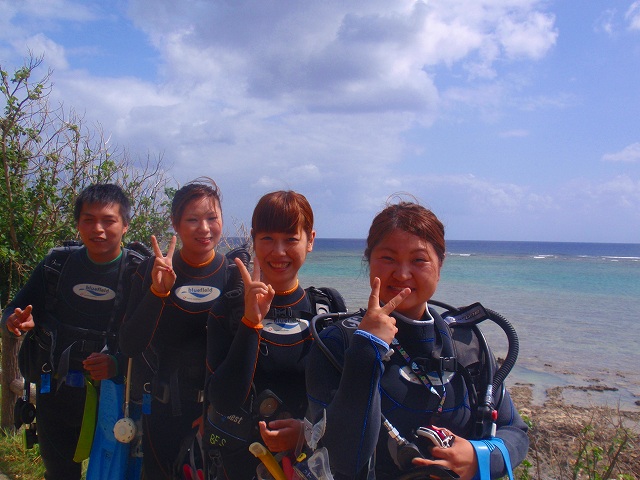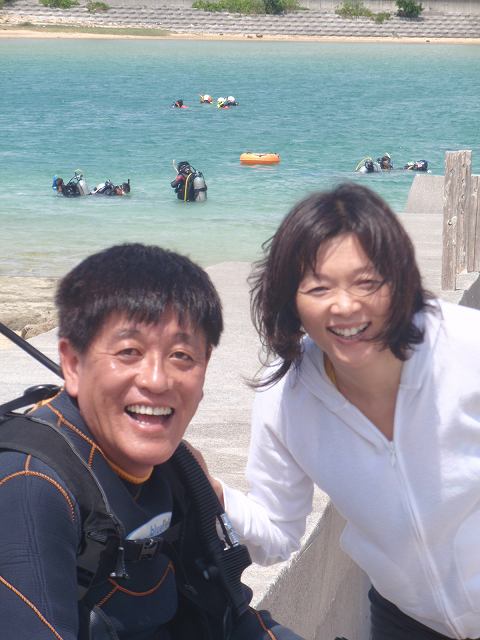 奥武島で、体験ダイビングの奥様に見守られながらライセンス講習を終わらせてきたご夫婦。