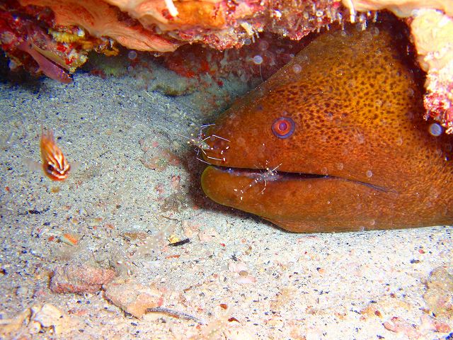 根の下をのぞくと、ソリハシコモンエビが大きなウツボをクリーニング。アカシマシラヒゲエビも隠れています。