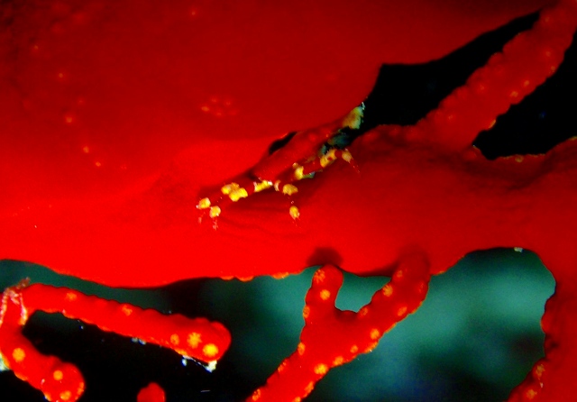 いろいろ探すと、ムチカラマツにはペアのムチカラマツエビ。それから、イソバナにはイソバナガニが無数についているところもありました。