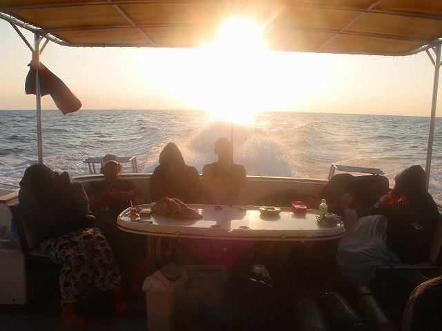 慶良間に沈みかける夕日を背に浴びながら、、、今日1日を遊びつくしたのか皆さんぐっすりと眠っていました。