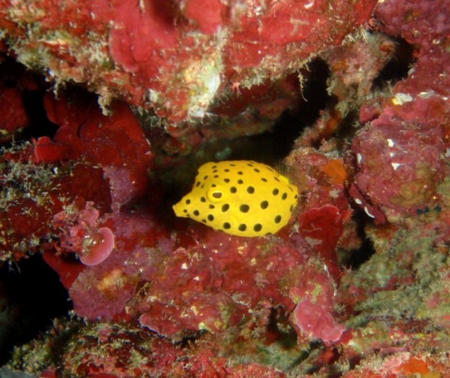 イロブダイの幼魚がゆらゆらと泳いでいたり、まるでサイコロのような姿のミナミハコフグの幼魚を3人で一生懸命撮影。