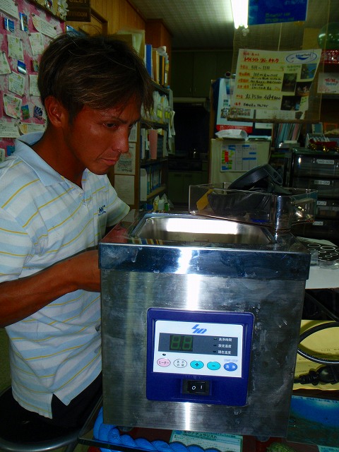 この機械は超音波洗浄機といって、器材にこびりついた塩やサビを綺麗にとってくれる優れ物♪