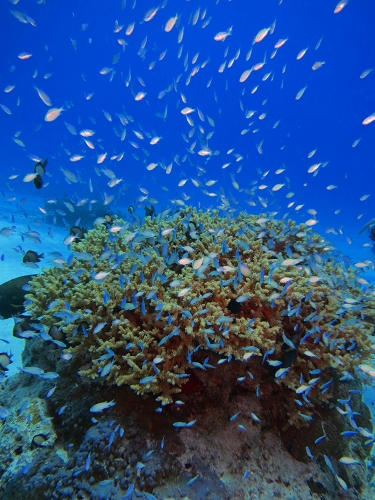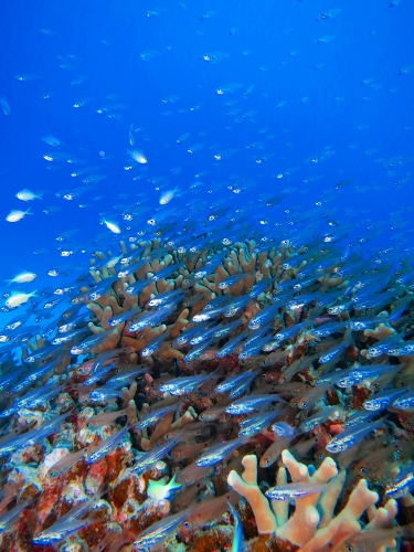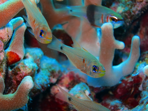 今日もサンゴに群れるスズメダイの仲間やテンジクダイの仲間もぐっちゃり!!